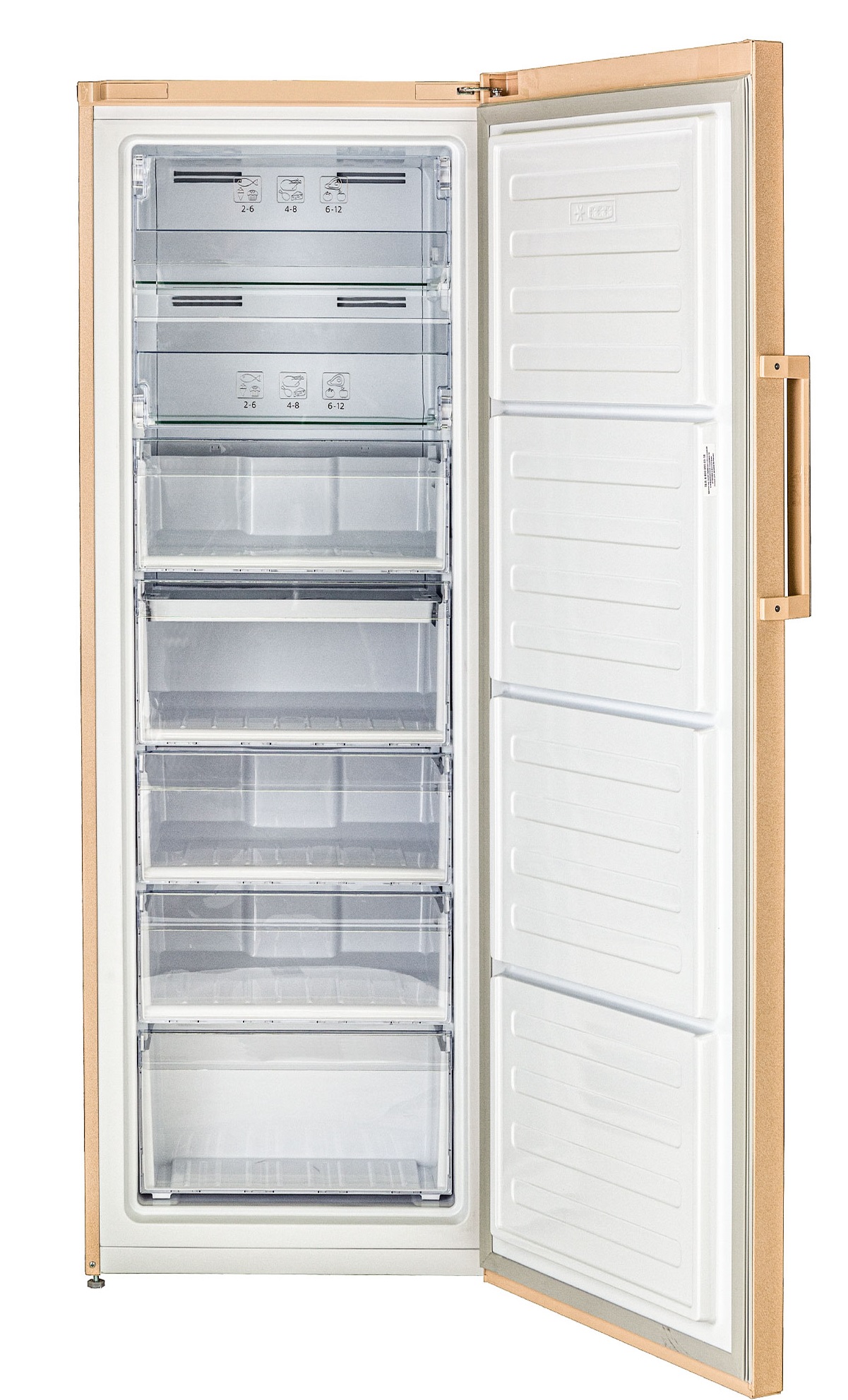 Вместительная морозильная камера бежевого цвета. Морозилка имеет электронное управление, которое выведено на удобный сенсорный дисплей, и общий объем 290 л. 7 прозрачных полок и ящиков предназначены для быстрой заморозки фруктов, ягод, овощей, зелени, мяса, рыбы и готовых блюд. Дверь морозилки крепится как к правой, так и к левой стенке для удобного использования.