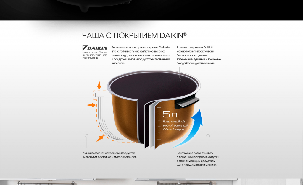 В комплекте | книга «120 рецептов» контейнер для приготовления на пару мультиварка плоская ложка руководство по эксплуатации сервисная книжка съемная внутренняя крышка упаковка чаша с антипригарным покрытием DAIKIN® черпак шнур электропитания |