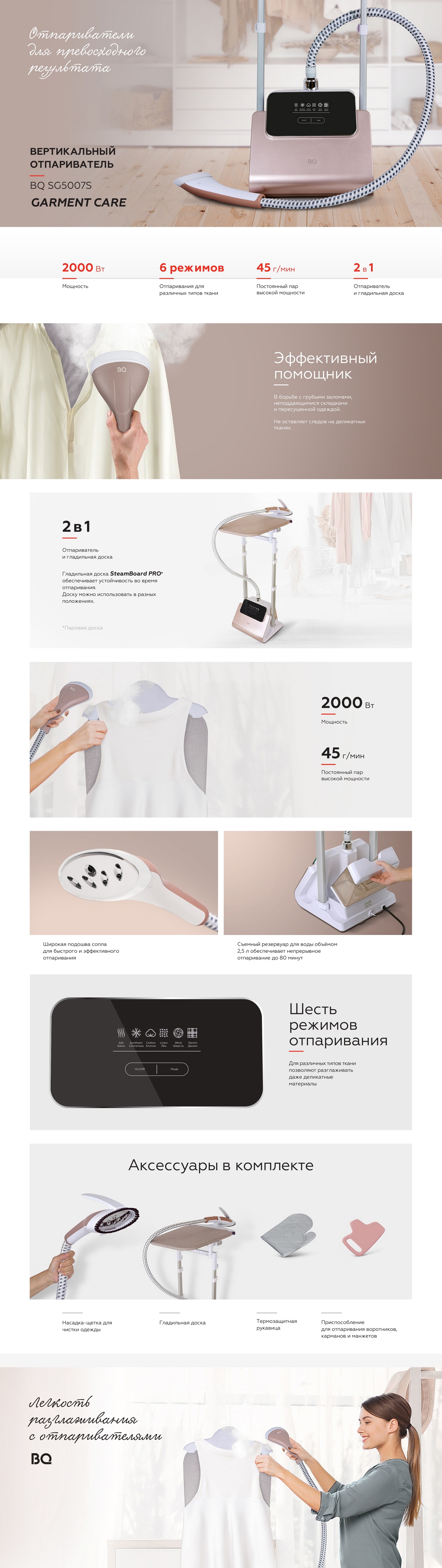 | Дополнительная информация | Вертикальный отпариватель, насадка-щетка, приспособление для отпаривания воротничков, карманов и манжет, гладильная доска, термозащитная рукавица, руководство по эксплуатации |