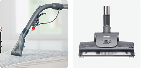 | Насадки в комплекте | пол/ковер; для мягкой мебели; щелевая; распыляющая для влажной уборки с адаптером для ковровых и твердых поверхностей; распыляющая насадка для мягкой мебели |