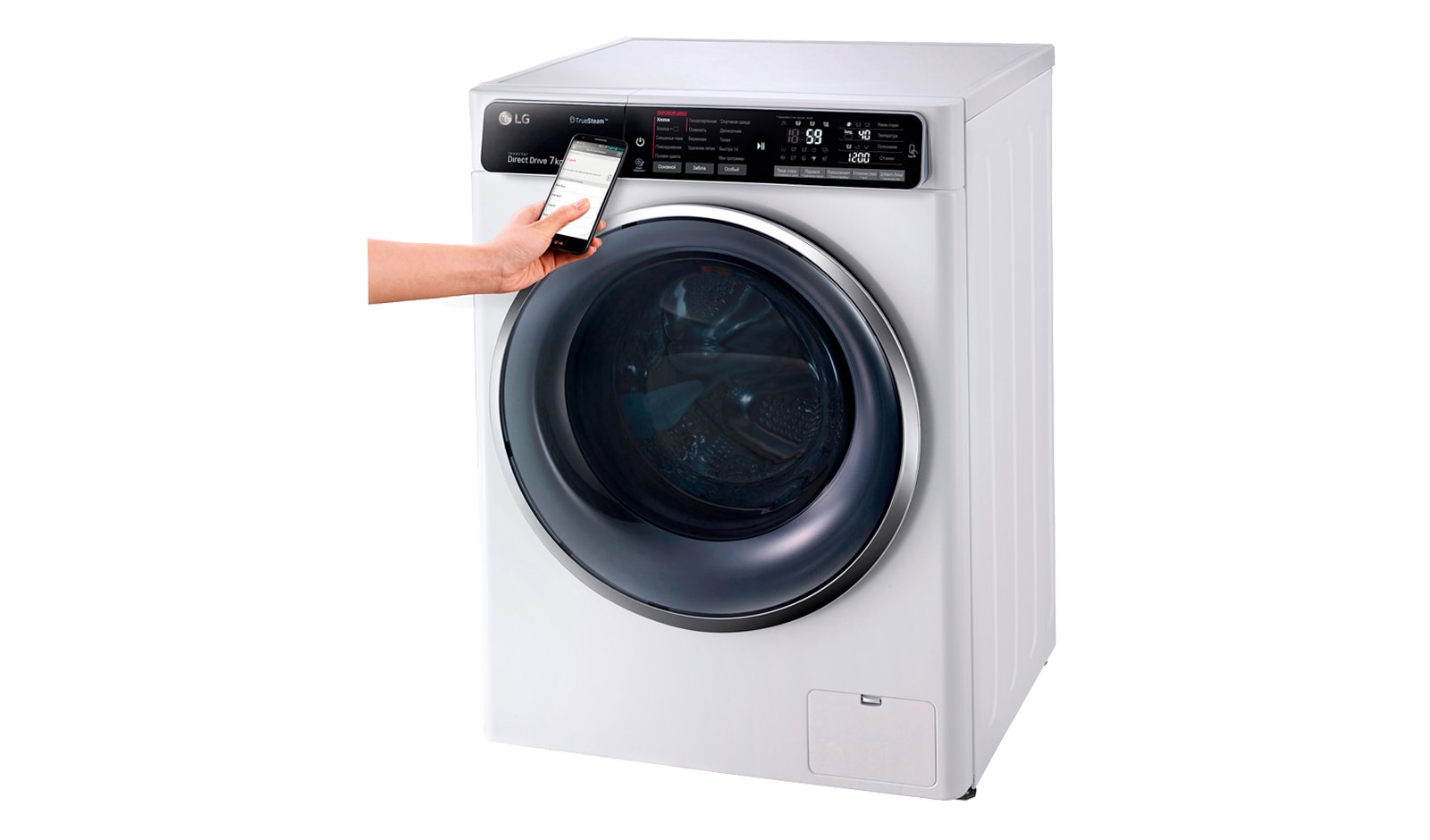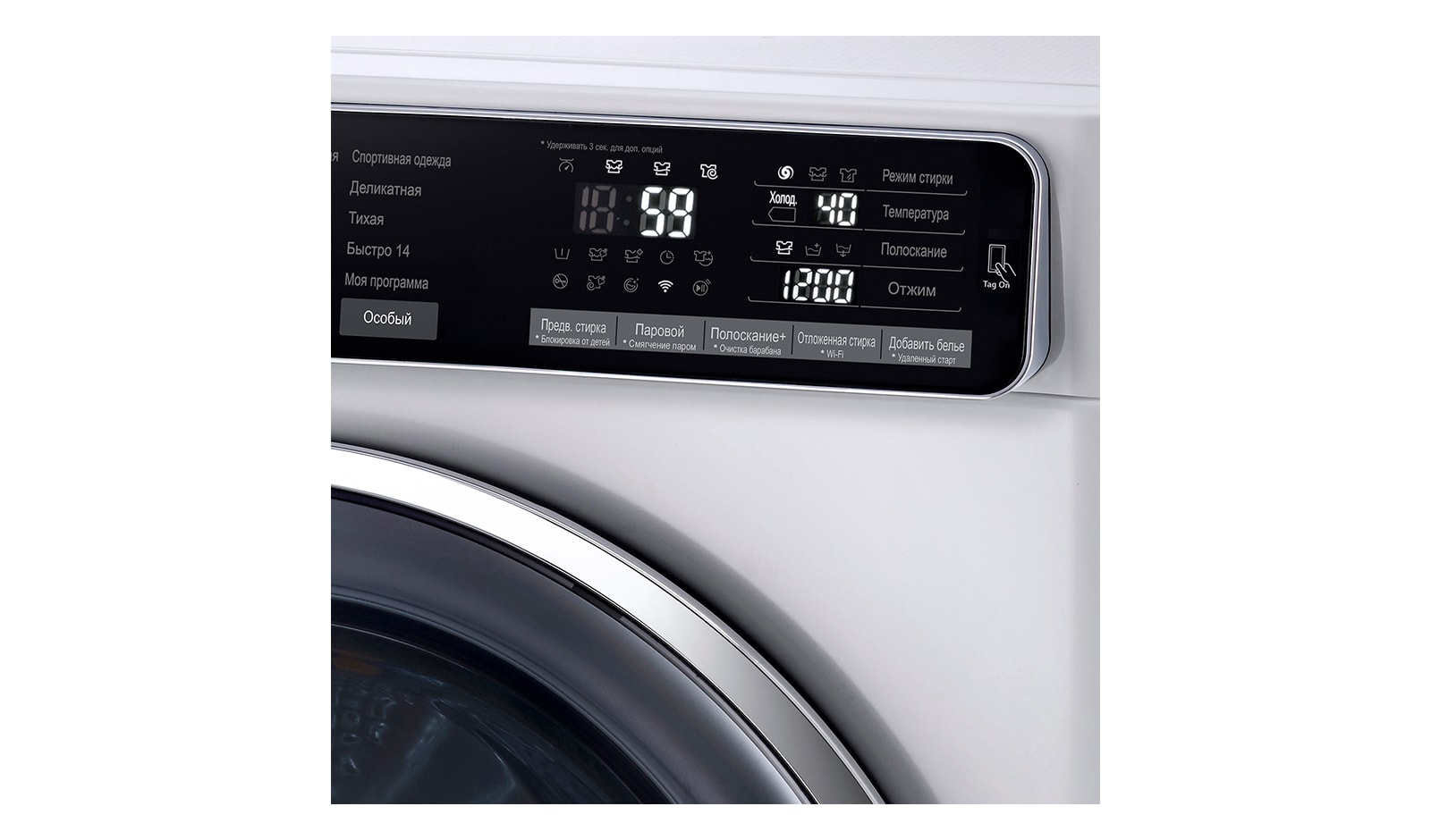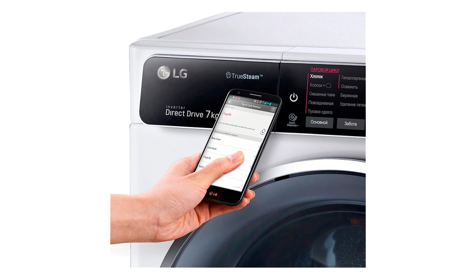 Технология Tag On позволяет использовать большинство смартфонов с поддержкой NFC для соединения с вашей стиральной машиной. Загрузив приложение LG Smart Laundry, вы можете скачивать и устанавливать новые режимы стирок.