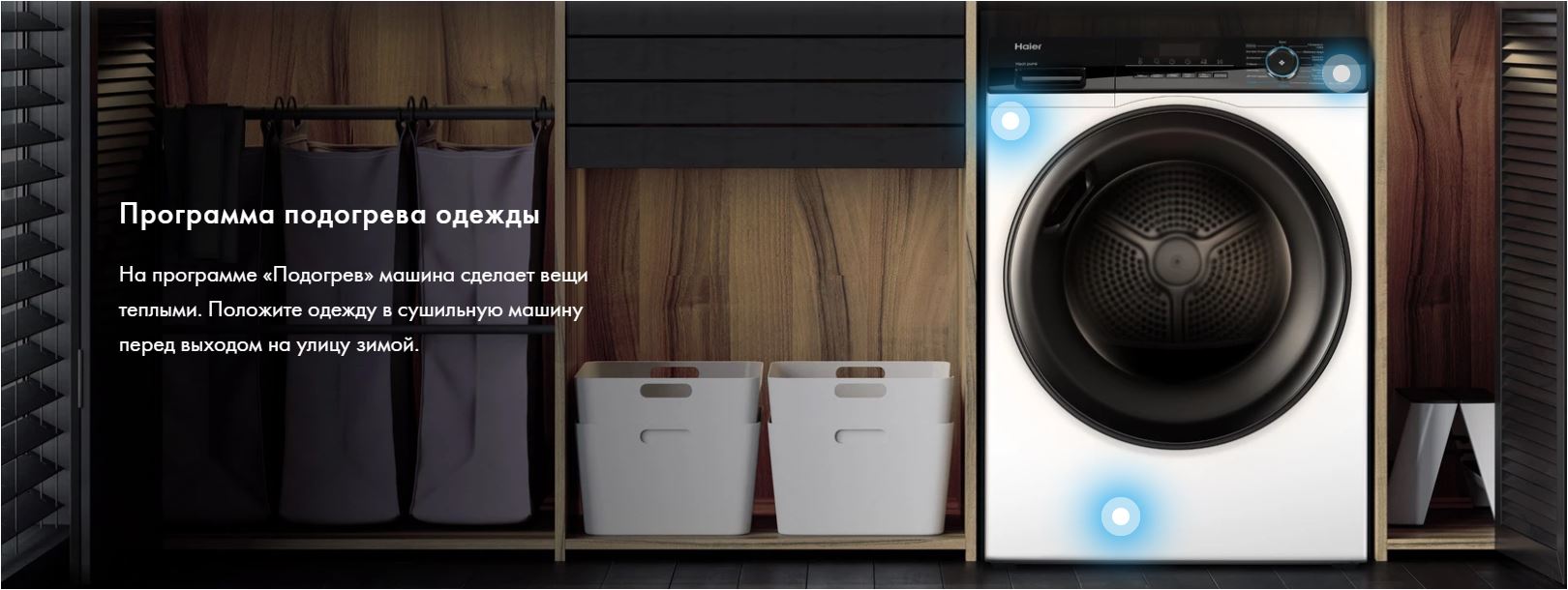 | Программы | Деликатная сушка Да Синтетика Да Смешанные ткани Да Шерсть Да Детская одежда Да Сушка по времени, Объемные вещи, Пуховые вещи, Рубашки, Подогрев одежды, Быстрая 30 мин, Спортивная, Хлопок, Гигиена, i-Refresh |