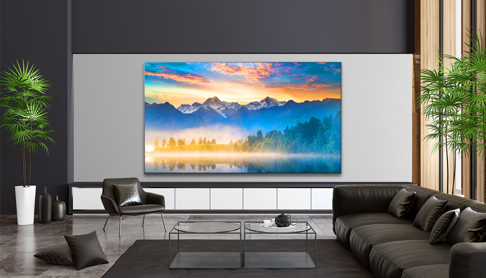 Настенный монтаж позволяет сделать стену и телевизор единым целом и создать ощущение картинной галереи.