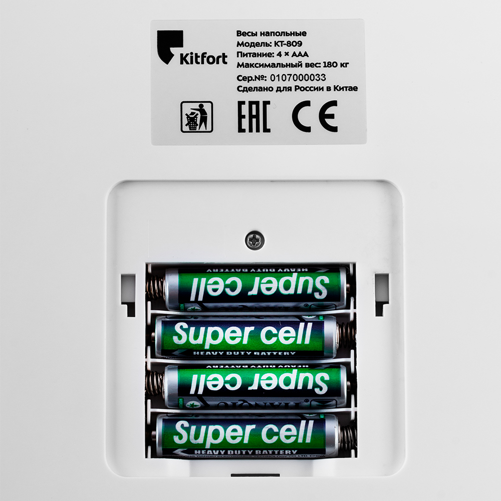На обратной стороне устройства находится разъём для батареек. Низкое энергопотребление обеспечивает бесперебойную работу устройства от одного комплекта из четырёх батареек AAA. Включение и выключение весов происходит автоматически.1