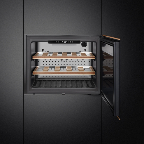 Холодильный шкаф для вина Smeg CVI621NR3 из коллекции Dolce Stil Novo оснащен удобным сенсорным управлением, при помощи которого можно быстро настроить температуру внутри камеры в зависимости от вида напитка. Деревянные полки на телескопических направляющих легко выдвигаются, что гарантирует комфорт эксплуатации.